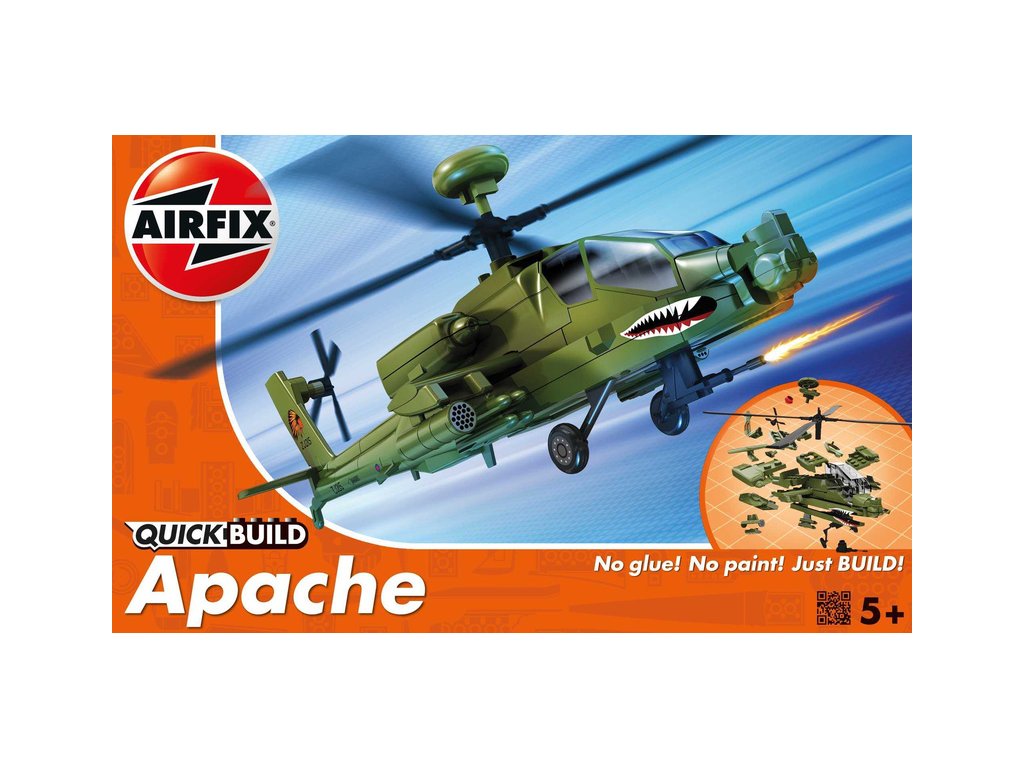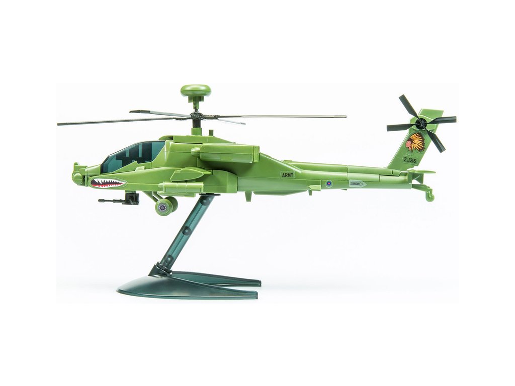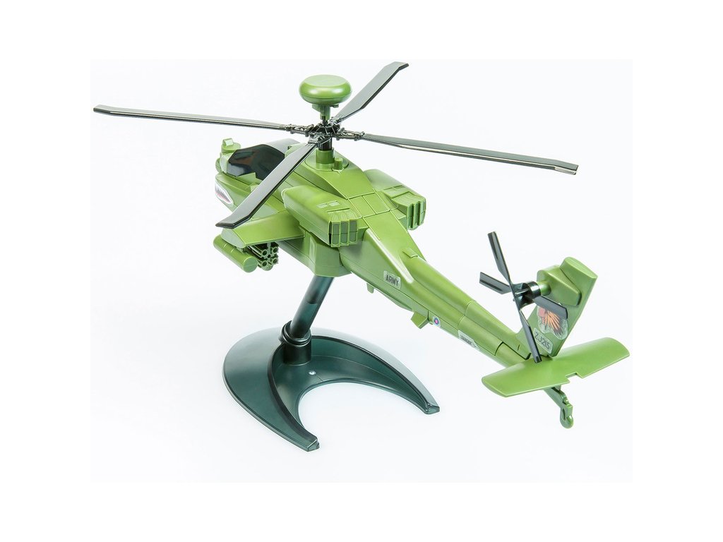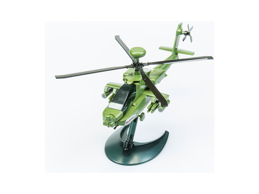 Sestavte si svůj vlastní vrtulník Apache! Tento model dvoumotorové útočné helikoptéry se může pochlubit otáčejícím se hlavním i ocasním čtyřlistým rotorem. Jak jinak než v pravé vojenské zelené. Tento kousek má i se stojánkem na výšku 129 mm. Skládá se z celkem 37 částí, stojánek pak z dalších 3.