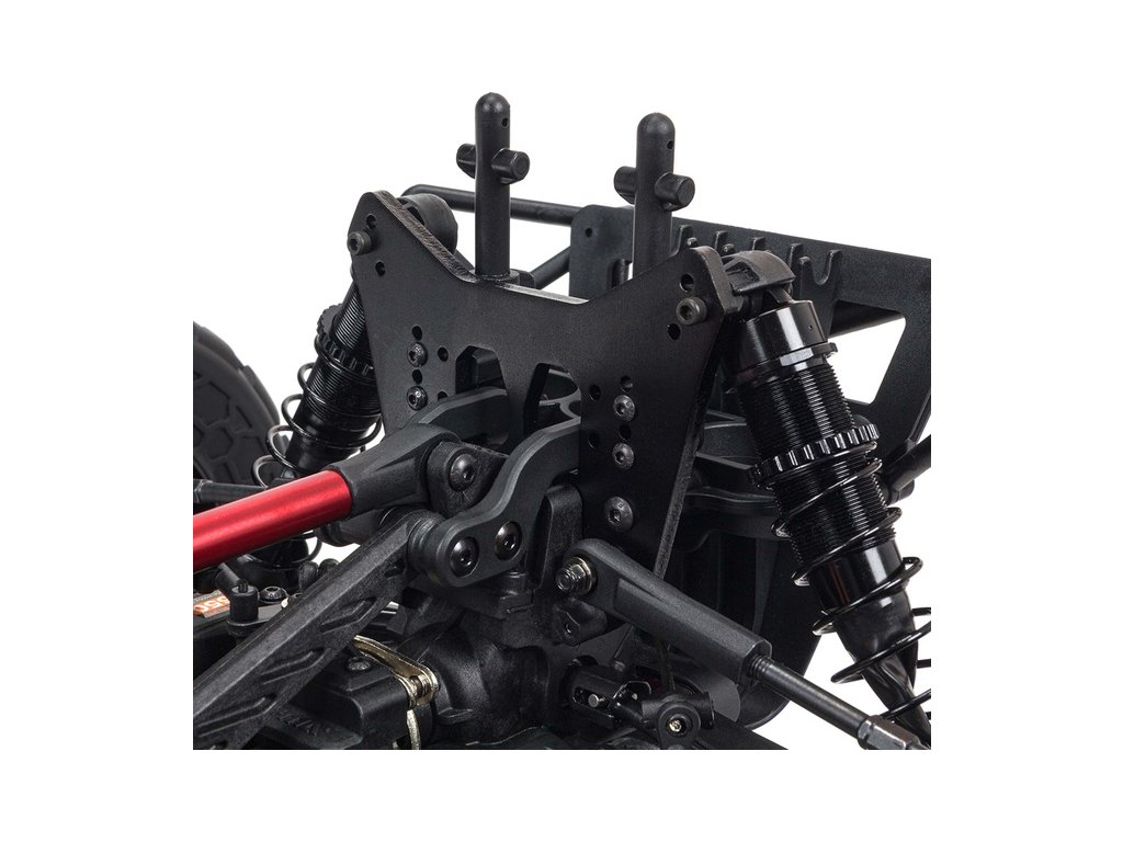 Dálkově řízené auta FIRETEAM ™ je navrženo pro maximální odolnost. Hliníkovou desku šasi doplňují jednotlivé výztuhy tlumičů, včetně středové červeně eloxované hliníkové výztuhy. Boční stupačky mají autentický vzhled a rovněž modelu přidávají na houževnatosti.