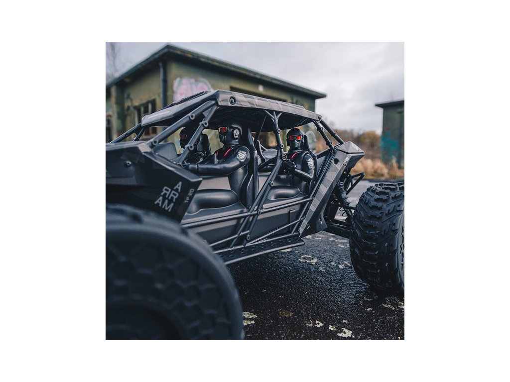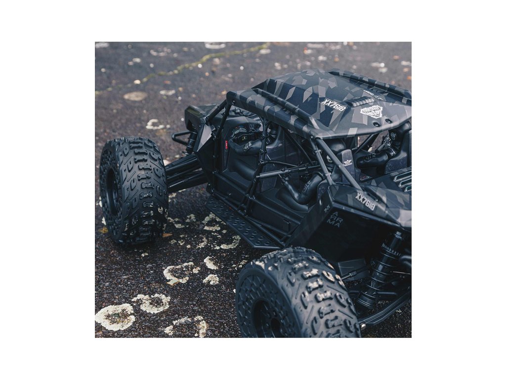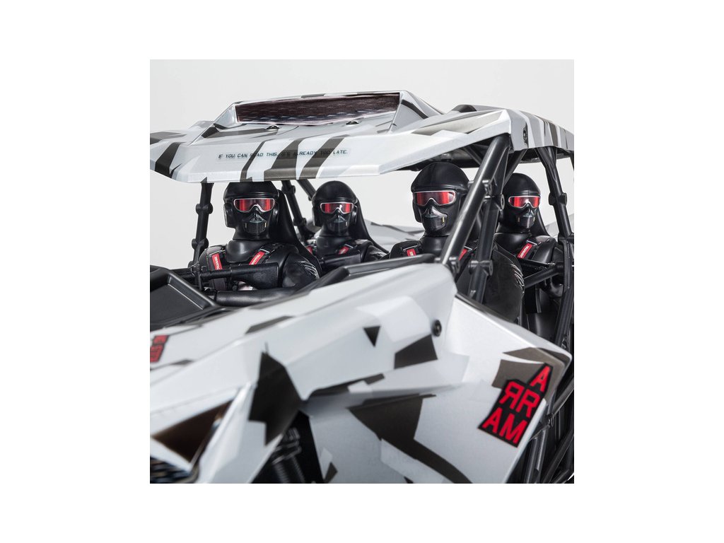 RC model auta vojenského taktického vozidla pro rychlý přesun Arrma Firearm Speed Assault v měřítku 1:7, postavený na vylepšeném, odolnějším podvozku Arrma 6S s delším rozvorem, širším rozchodem a měkčími tlumiči. Pro ještě více zábavy a jízdních možností je v modelu nainstalovaná dálkově řízená mechanická ruční brzda.