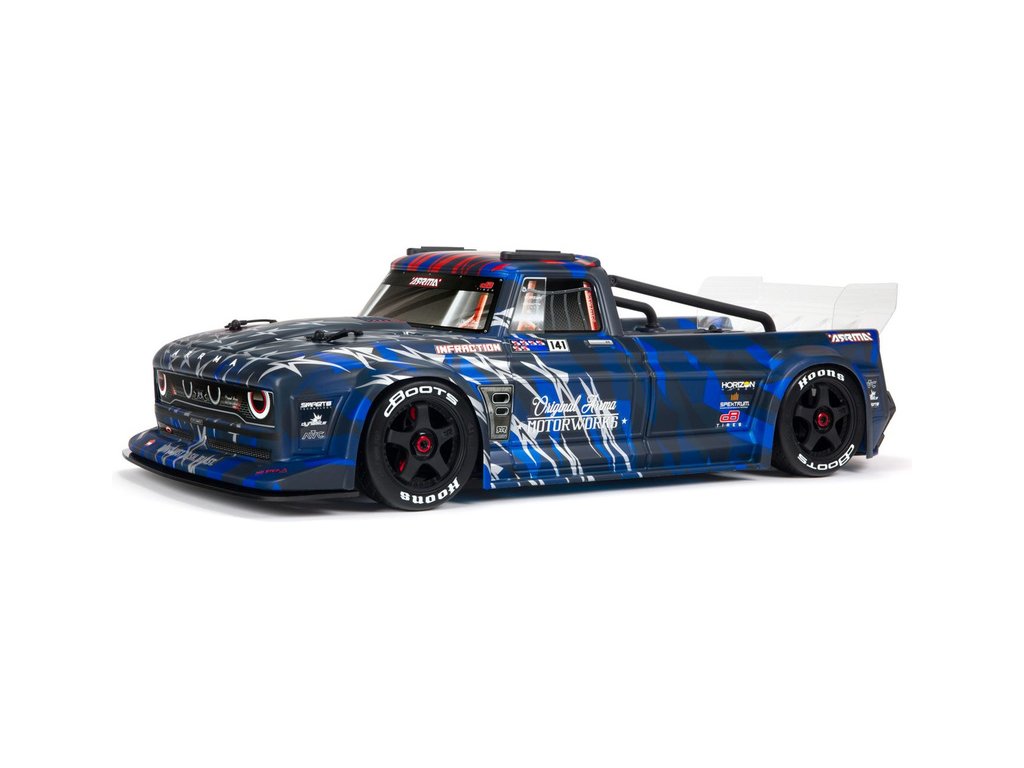 Arrma Infraction v měřítku 1:7, je výkonný RC model, který jede rychlostí až 120 km/h. Model s náhonem na všechna kola 4x4, je zejména vhodný na tvrdé povrchy jako je asfalt, či beton. Poradí si také se šotolinovými povrchy, nízkou trávou a lehkým rovinatým terénem. Model obsahuje dálkově řízenou ruční brzdu, kterou zabrzdíte zadní nápravu. To Vám umožní snadné driftování s modelem. Pokročilá aerodynamika předního nárazníku, zadního difuzoru a spoileru vytváří přítlak, který zlepšuje ovladatelnost modelu. Pneumatiky dBoots® Hoons ™ s vysokou přilnavostí jsou nalepeny na realistických 5-ti paprskových kolech.