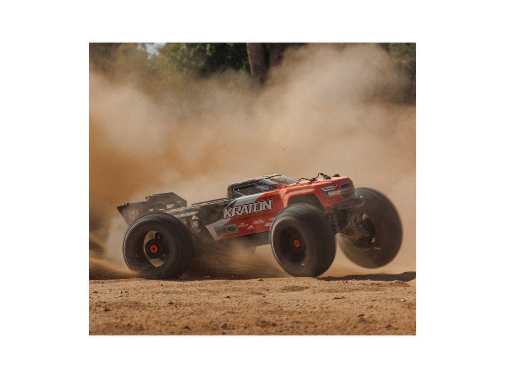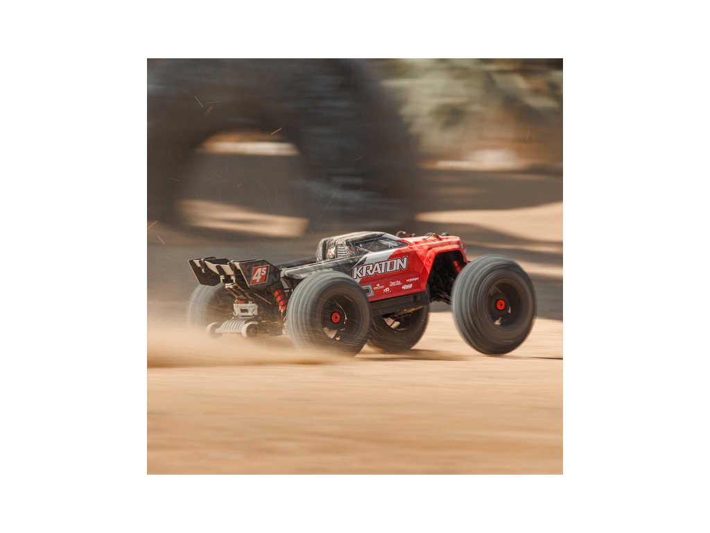 RC model Arrma Kraton 4S V2 BLX je poháněný střídavým motorem s brutální akcelerací a jede rychlostí až 80 km/h. Nově obsahuje výkonnější elektronikou a středový diferenciál. Odolné kompozitní šasi a kovové pohonné ústrojí, olejové tlumiče a detailní karoserie.