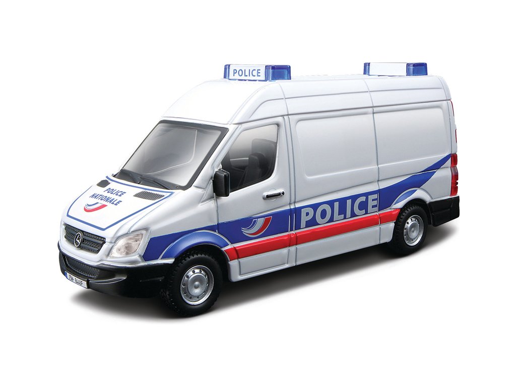 Kovový model užitkového vozu Bburago 18-32006 Mercedes-Benz Sprinter v měřítku 1:50 je dodáván v papírové krabičce. Barva modelu je bílá - policie.