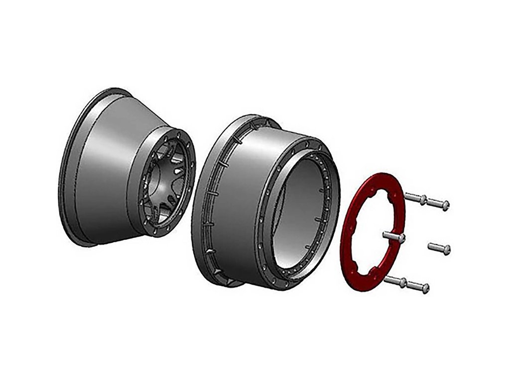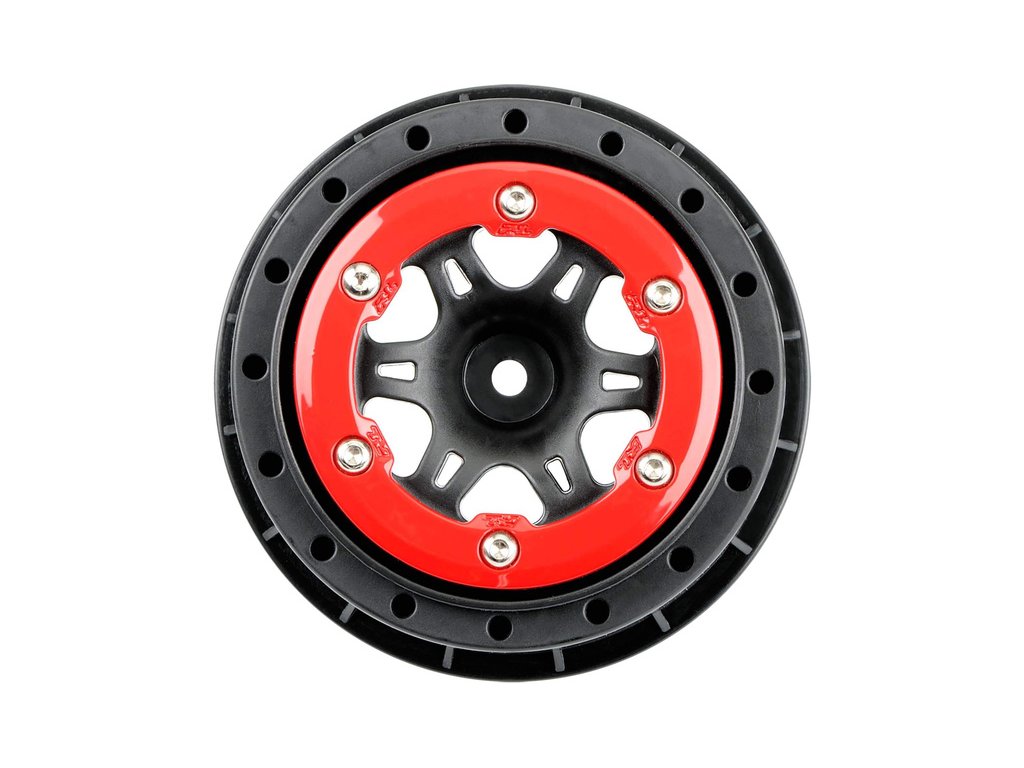 Disky Split Six 2.2"/3.0" Short Course – zadní, pro RC modely aut 1:10. Barva černá, červený kroužek. Unašeč je šestihran 12 mm.