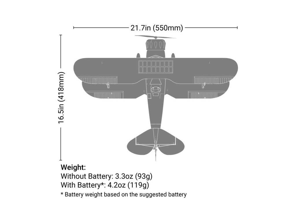 Populární sportovní americký dvouplošník Waco jako mikro RC model BNFod E-flite. Rozpětí 550 mm, střídavý pohon pro LiPol baterii 2S-3S 300mAh (není v balení), exkluzivní technologie elektronické stabilizace Spektrum™ SAFE Select a 3-osého gyroskopu AS3X®. Telemetrie napětí baterie v reálném čase je dostupná s kompatibilními vysílači Spektrum, vybavenými Spektrum AirWare™. Je vyroben z pokročilého materiálu EPS pro lehký, ale odolný drak modelu, nainstalována jsou lineární digitální serva, řídící jednotka, řada maketových doplňků.