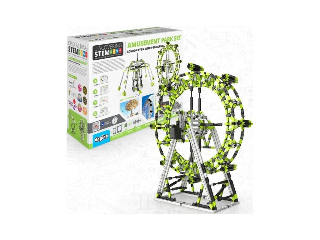 Zábavné výukové stavebnice Engino Stem Zábavní park London Eye a kolotoč, postavte si dva velké modely, slavné vyhlídkové Oko (Eye) v Londýně a kolotoč! Tato sada obsahuje i motor s převodovkou pro pohon. Můžete experimentovat s ozubenými koly stavěním čtyř menších modelů. Vhodné pro věk 9+.