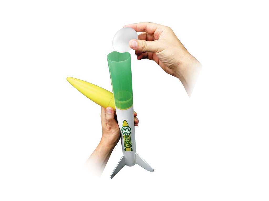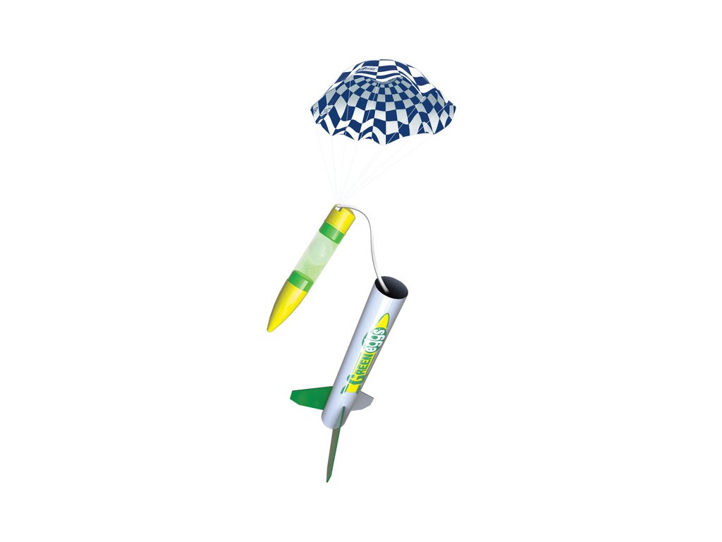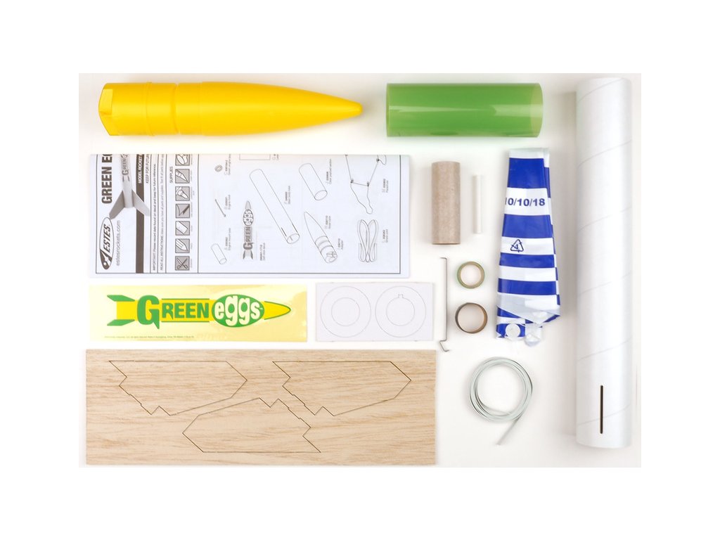 Výuková sada 12 raket Estes Green Eggs na raketové motory řady C - D. Do rakety je možné vložit až dvě vajíčka a Vy si můžete vyzkoušet jestli je bezpečně dopravíte na zem. Rakety s vajíčky létají do výšky 251 m a k zemi se snesou díky padáku o průměru 45,7 cm. Tubus pro uložení vajíček je průhledný, aby jste ihned viděli zda-li se pokus podařil.