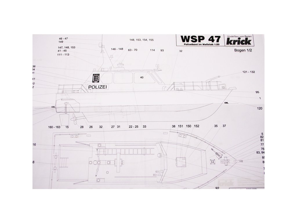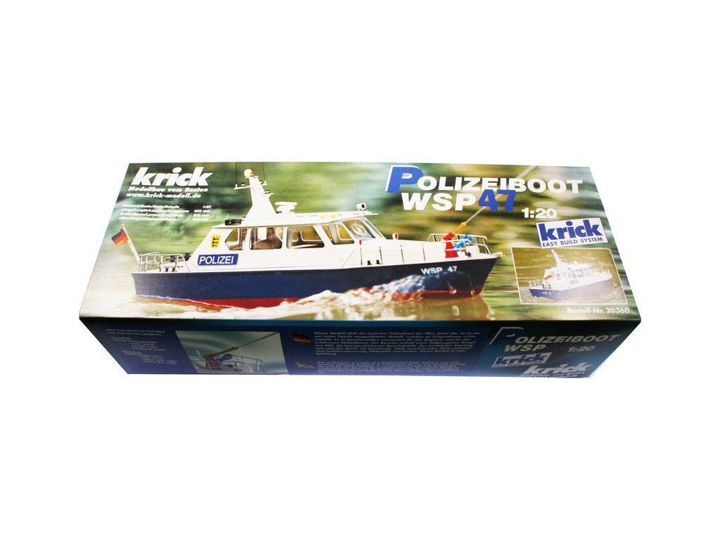 Stavebnice RC modelu lodi od firmy Krick, Policejní člun WSP47. Model je určen pro začínající lodní modeláře. Obsahuje plastový trup z ABS, dřevěné díly paluby a interiéru, motor Speed 400, lodní šroub s hřídelí, maketové díly a montážní příslušenství.