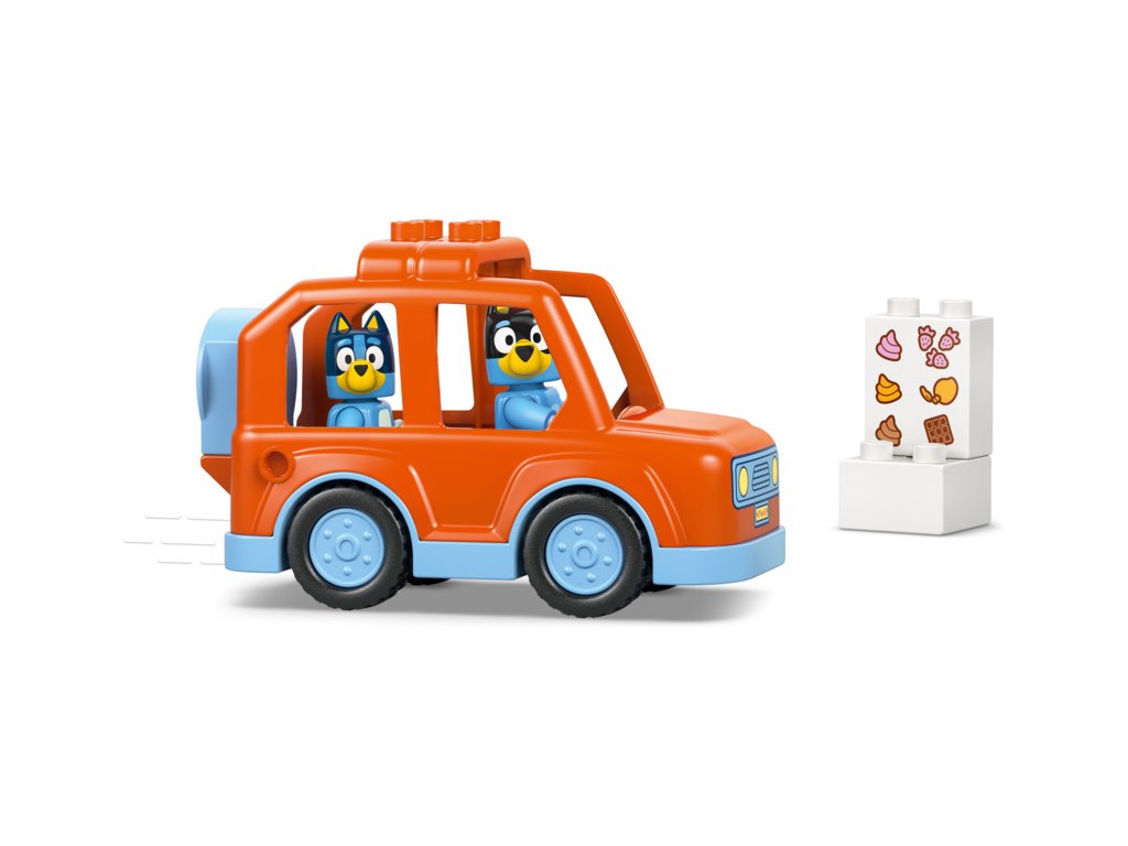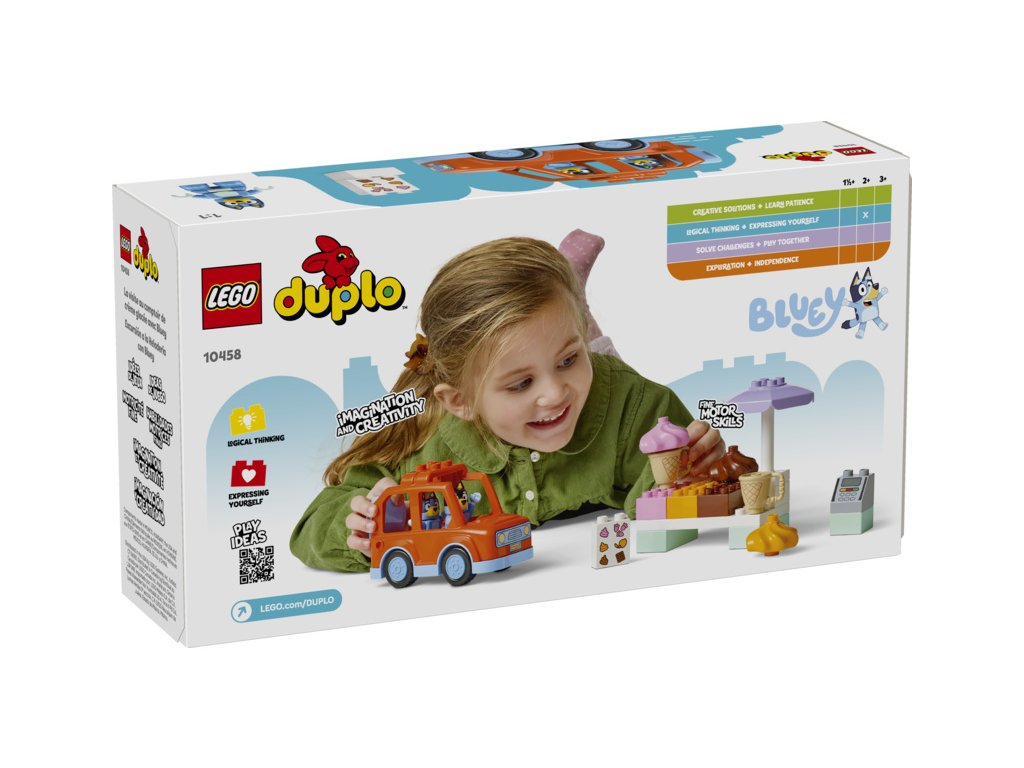 Pusťte se s malými dětmi do zábavného hraní se stavebnicí Bluey a výlet na zmrzlinu (10458). Malí stavitelé si užijí nápadité hraní na dobrodružství s touto stavebnicí LEGO® DUPLO® s vozidly, se kterými si připomenou scény z televizního seriálu Bluey.