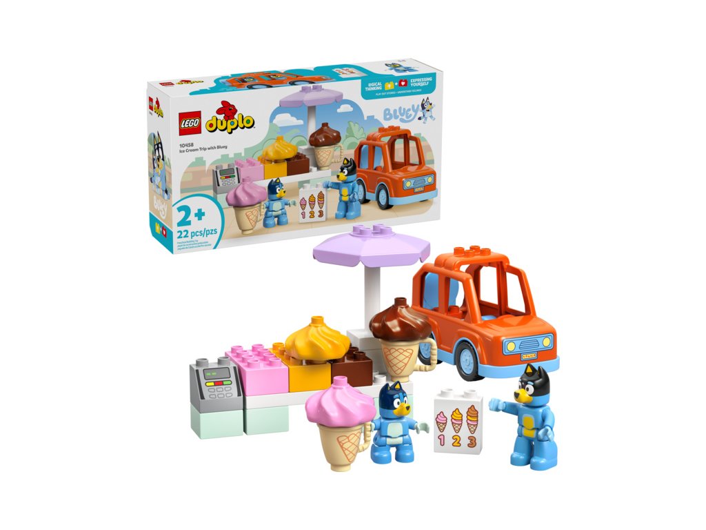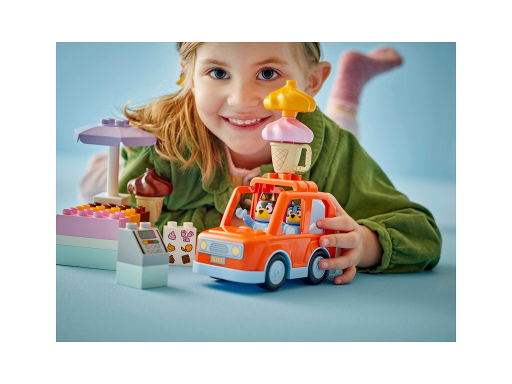 Batolata procvičí svou dovednost poznávání čísel tím, že si vyberou, kolik kopečků zmrzliny chtějí, a naskládají na sebe správný počet kostek. Začnou také třídit barvy při nabírání příchutí a procvičí si jemnou motoriku při umisťování zmrzliny na kornouty. Stavebnice LEGO DUPLO Bluey umožňují malým dětem a jejich rodinám přehrávat si každodenní činnosti a přemýšlet, jak se při těchto činnostech cítí. Stavebnice obsahuje 22 dílků.