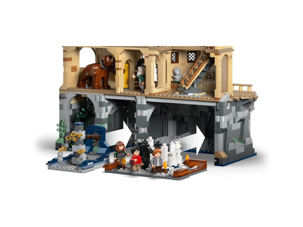 - Stavebnice hradu – Místnosti s okřídlenými klíči a kouzelnickými šachy ve skalních základech hradu lze odejmout pro snadné hraní a součástí je také 6 ze 14 sběratelských bradavických portrétů