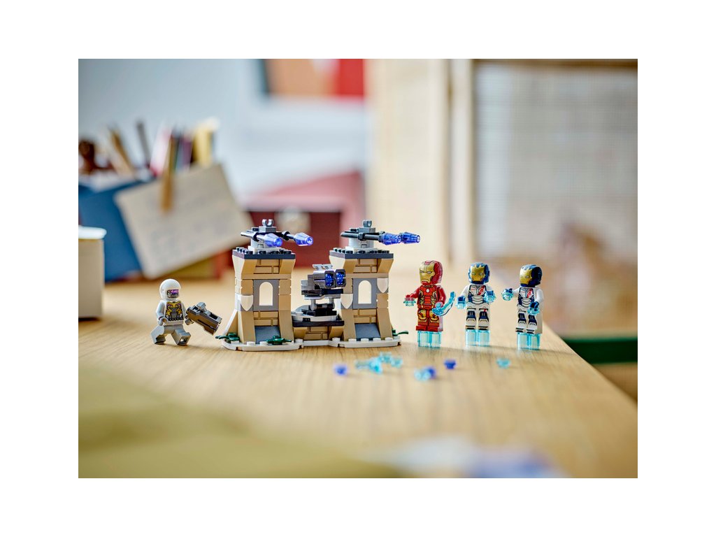 Stavebnice obsahuje 4 minifigurky: Iron Mana, 2 Železné legionáře, a vojáka Hydry. Sestavitelný model Iron Mana má otevírací hledí a drží energetický blaster. Voják Hydry má vystřelovač. Součástí jsou jasně modré kostky, které vytvářejí dojem, že minifigurky létají. Sestavitelný model základny Hydry zahrnuje 2 vystřelovače připevněné k otočné podlaze, kam mohou děti postavit vojáka Hydry, aby mířil na přicházející superhrdiny. Na vrcholu věží základny jsou 2 páry odpalovačů raket (nestřílejících) k odvrácení útoku. K doplňkovým digitálním funkcím se dostanete prostřednictvím aplikace LEGO Builder.