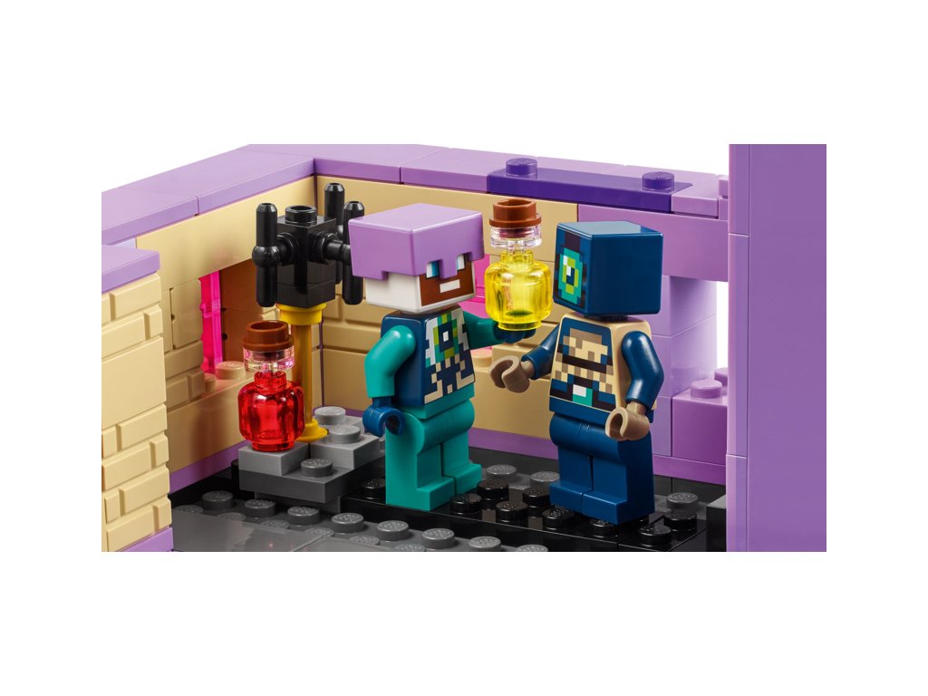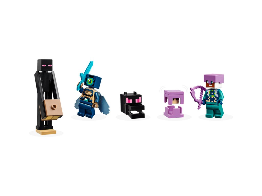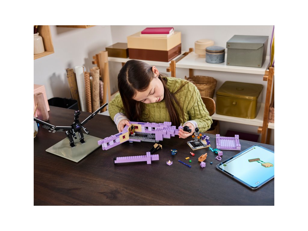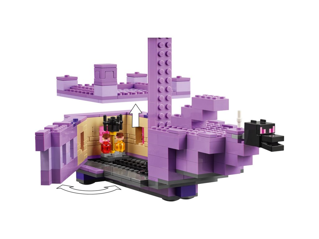 Hráči vstoupí do nebezpečného biomu End, kde se musí postavit drakovi z Enderu. Všechny končetiny této figurky s klouby jsou pohyblivé a upravitelné. Loď z Endu má plně vybavený interiér, do kterého vstoupíte skrz zvedací střechu a otevírací boční strany. Dračí hlavu z přídě lze odejmout a nosit ji jako přilbu. Uvnitř děti najdou varný stojan s lektvary zdraví. Mezi postavy z Minecraftu najdete průzkumníka Enderu s krovkami a ohňostrojovou raketou, rytíř zEnderu, Shulker a Enderman. Součástí je také cenné dračí vejce. Více digitální zábavy si stavitelé užijí s interaktivní aplikací LEGO® Builder, ve které mohou přibližovat a otáčet modely ve 3D a sledovat svůj pokrok.