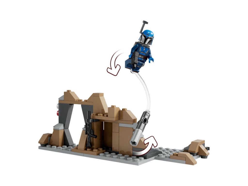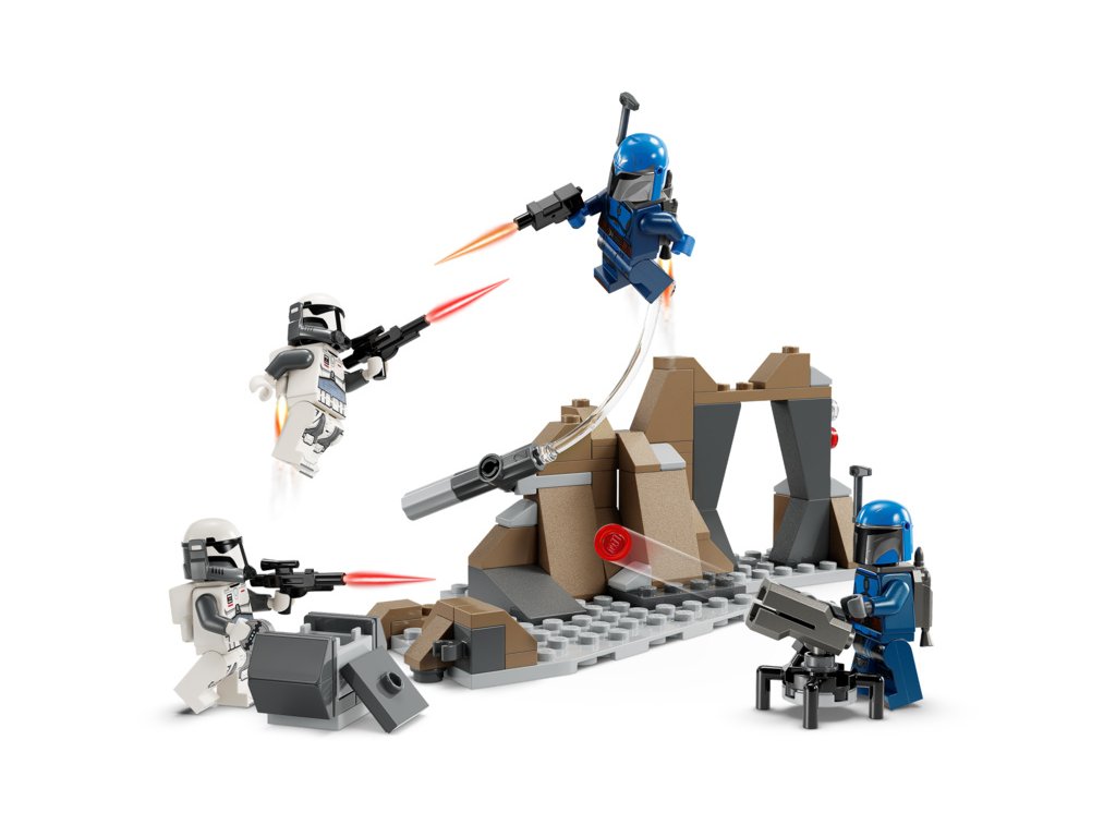 - 4 sběratelské minifigurky LEGO® Star Wars™ – Mandaloriánská Sůva a mandaloriánský válečník, každý s vlastním blasterem, 2 imperiální komanda, každé s vlastními blasterovými pistolemi, a navíc 4 jetpacky