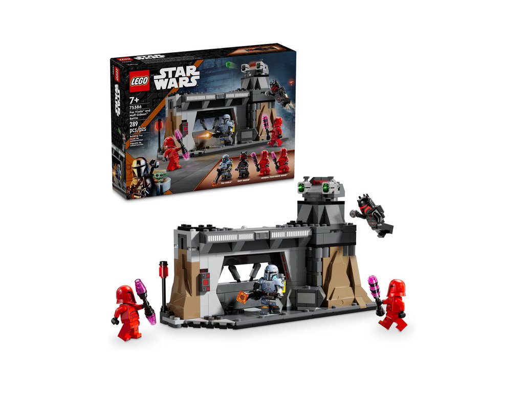 - Stavebnice LEGO® Star Wars: The Mandalorian pro děti – Znovu prožijte napínavou bitvu ze 3. řady seriálu Star Wars: The Mandalorian se stavebnicí Souboj Paze Vizsly a Moffa Gideona