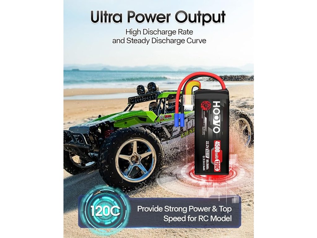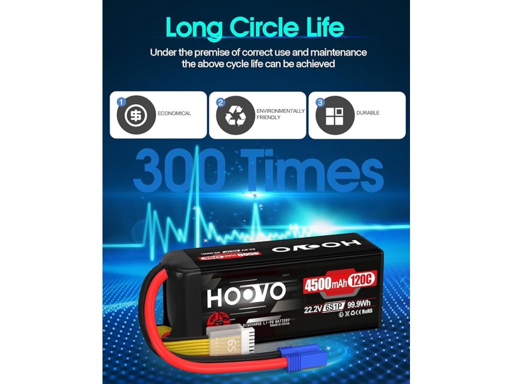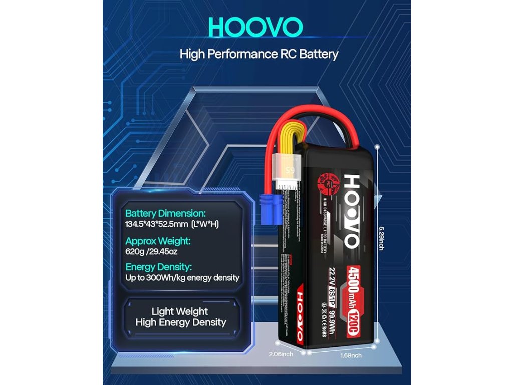 LiPo baterie HOOVO 4500 mAh 22,2 V je výkonný 6S akumulátor určený pro náročné RC modely. Je vhodná pro piloty a jezdce, kteří potřebují stabilní napětí a rychlou odezvu. Vysoká vybíjecí schopnost 120C podporuje plynulý chod i při vysokém zatížení. Konektor EC5 je kompatibilní s konektorem IC5.