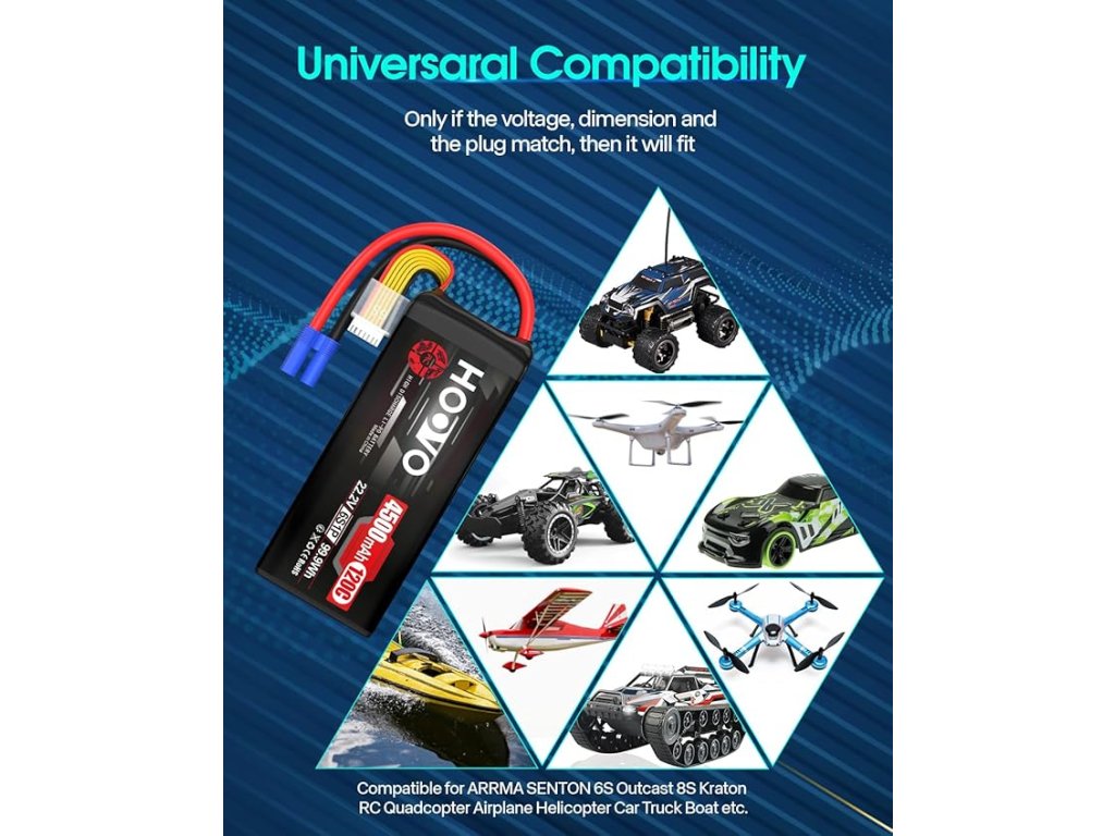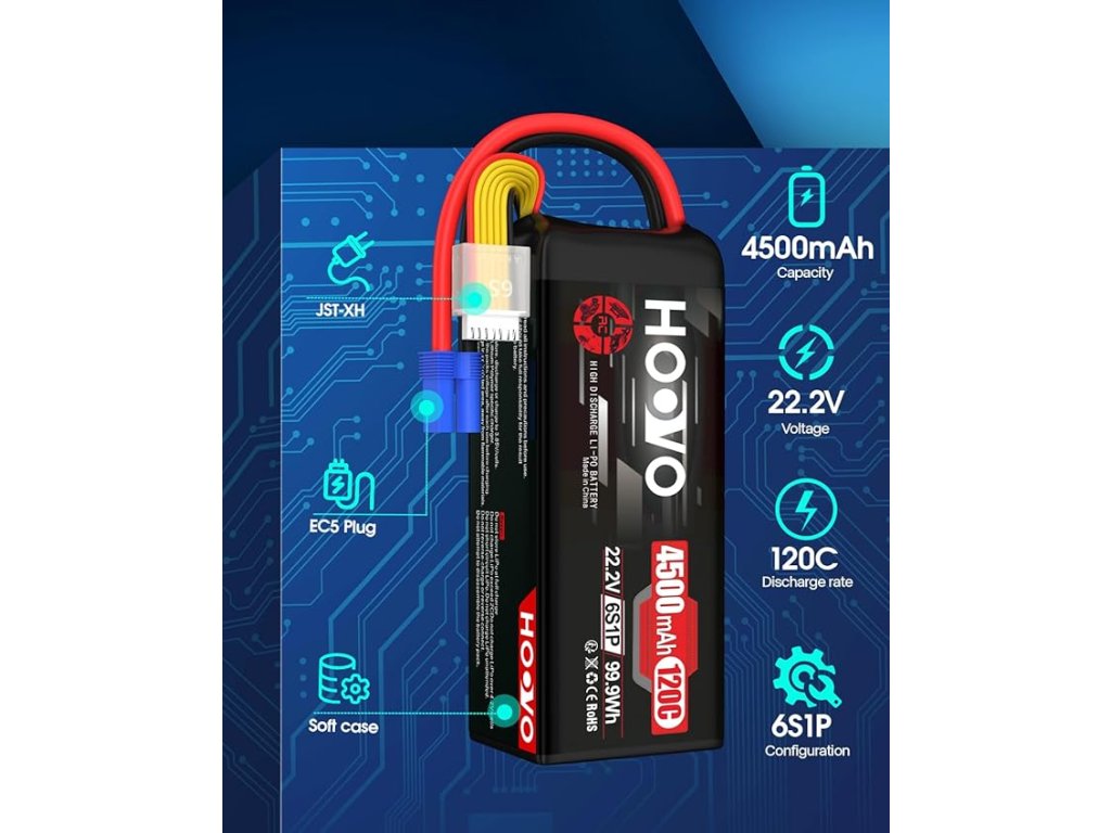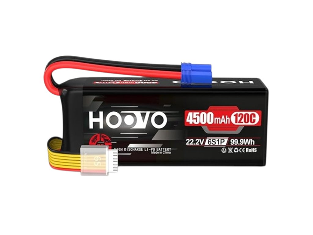 LiPo baterie HOOVO 6S 22,2 V 4500 mAh je výkonný akumulátor pro RC modely. Slouží k napájení aut, lodí, letadel a dronů, kde je vyžadována vysoká proudová zátěž a stabilní výkon.