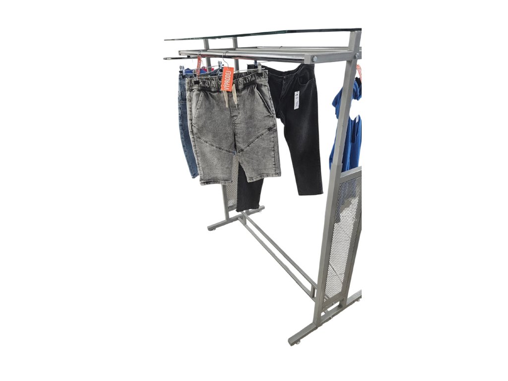 Designový oboustranný štendr do obchodu, ideální pro prezentaci oblečení v moderních a butikových prodejnách. Kombinuje závěsný prostor na ramínka s horní odkládací plochou pro vystavení složeného zboží nebo doplňků.
