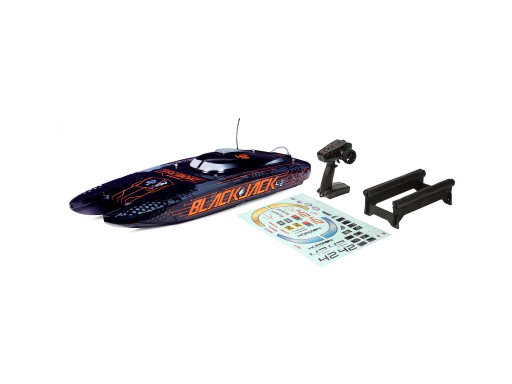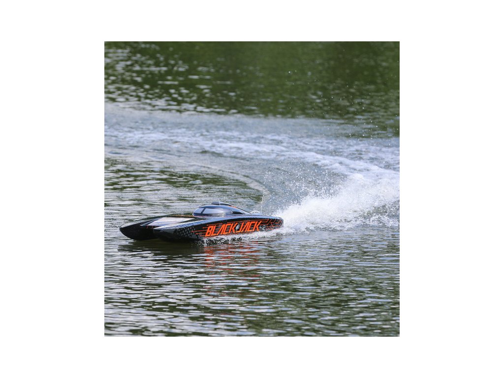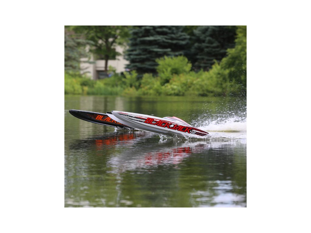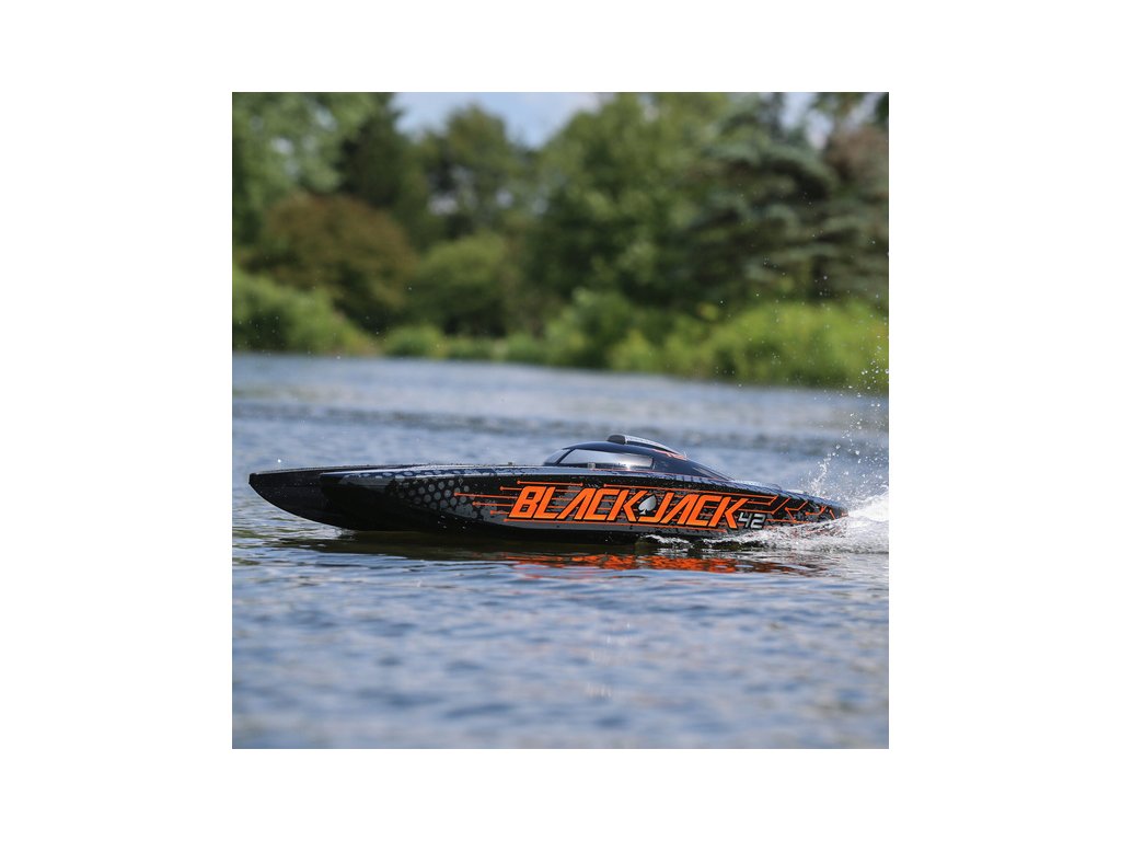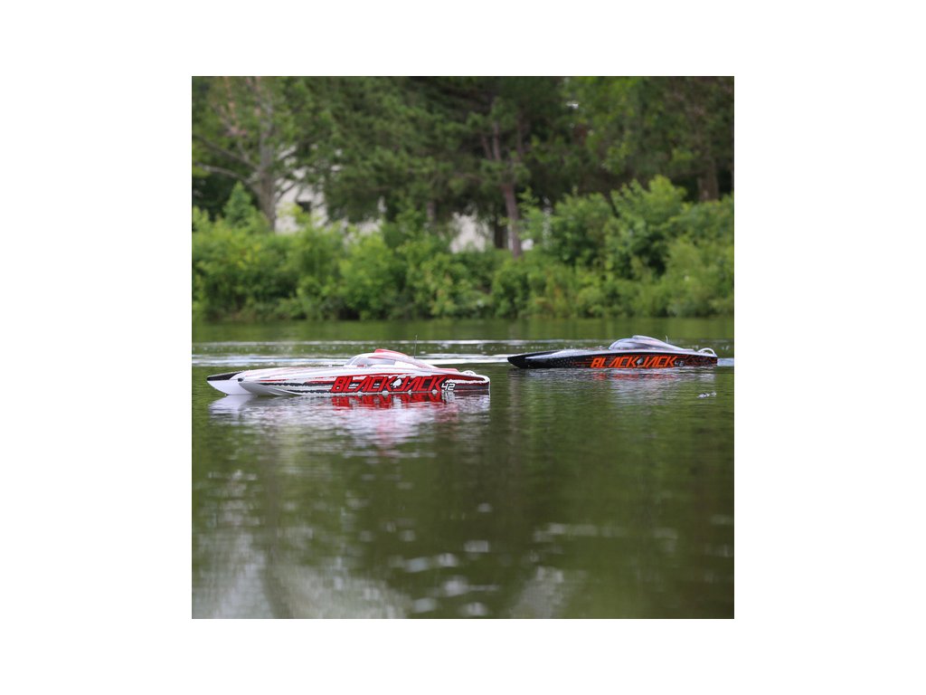 Výkonný člun Pro Boat® Blackjack™ 42 Brushless 8S Catamaran je návratem do časů závodů velkých závodních člunů, které stylově dokázaly nadchnout všechny diváky. Model má super výkonnou pohonnou jednotku, která má tyto komponenty: vodou chlazený elektronický regulátor otáček Spektrum™ 160A s vysokým napětím 8S, který spolupracuje se 4-pólovým vodou chlazeným motorem Spektrum™ Marine 4685. Ten je schopen podat výkon až 5,3 koní a dosáhnout rychlost až 85 km/hod! Neexistuje žádný jiný člun v této velikosti s tak velkou silou. Všechno je samozřejmě řízeno systémem Spektrum Smart™, díky kterému můžete mít parametry pohonu pod kontrolou. Vysílač Spektrum DX3™ a voděodolný 6-kanálový přijímač s telemetrií SR6110AT zajistí kontrolu díky integrované telemetrii. Blackjack je také vybaven nárazu-vzdorným polykarbonátovým trupem, polykarbonátovým krytem s hliníkovými šrouby, čistě tvarovanou kompozitní kostrou, hliníkovým kormidlem a vzpěrou vrtule.