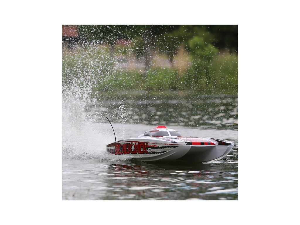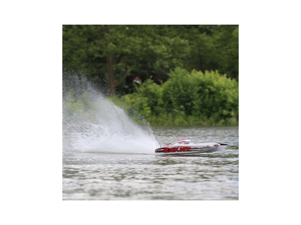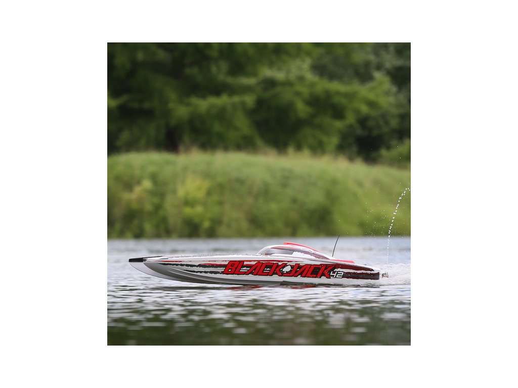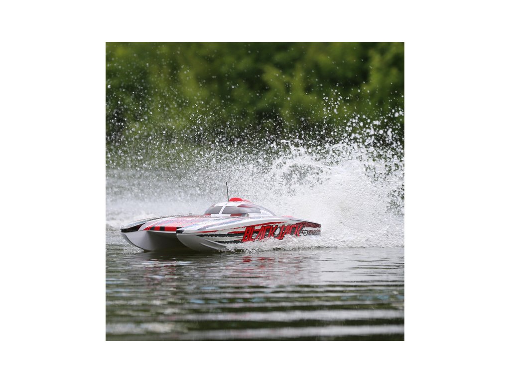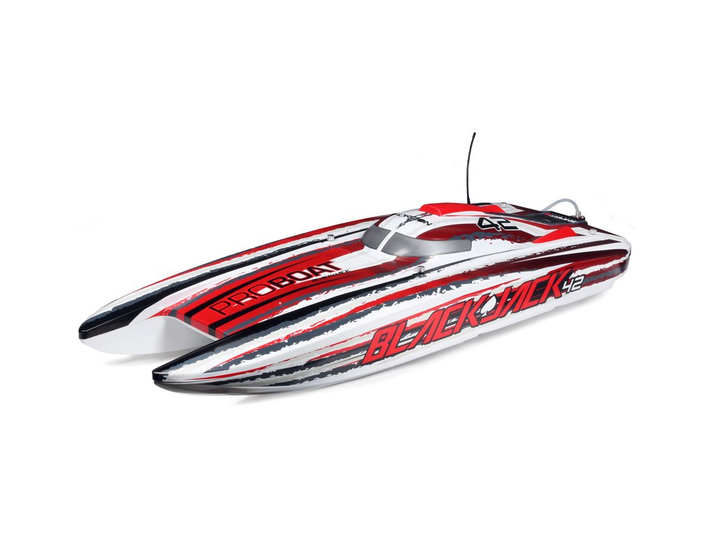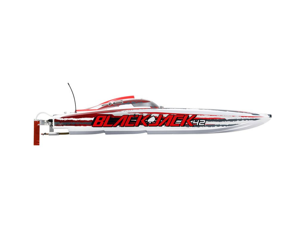 Výkonný člun Pro Boat® Blackjack™ 42 Brushless 8S Catamaran je návratem do časů závodů velkých závodních člunů, které stylově dokázaly nadchnout všechny diváky. Model má super výkonnou pohonnou jednotku, která má tyto komponenty: vodou chlazený elektronický regulátor otáček Spektrum™ 160A s vysokým napětím 8S, který spolupracuje se 4-pólovým vodou chlazeným motorem Spektrum™ Marine 4685. Ten je schopen podat výkon až 5,3 koní a dosáhnout rychlost až 85 km/hod! Neexistuje žádný jiný člun v této velikosti s tak velkou silou. Všechno je samozřejmě řízeno systémem Spektrum Smart™, díky kterému můžete mít parametry pohonu pod kontrolou. Vysílač Spektrum DX3™ a voděodolný 6-kanálový přijímač s telemetrií SR6110AT zajistí kontrolu díky integrované telemetrii. Blackjack je také vybaven nárazu-vzdorným polykarbonátovým trupem, polykarbonátovým krytem s hliníkovými šrouby, čistě tvarovanou kompozitní kostrou, hliníkovým kormidlem a vzpěrou vrtule.