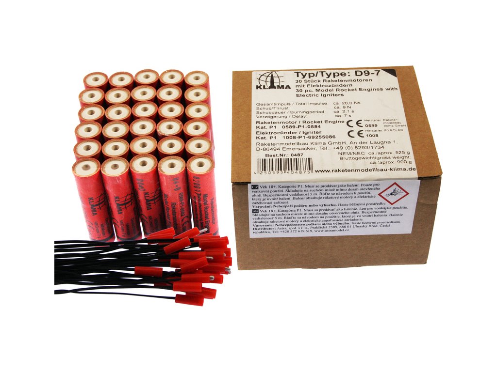 Raketový motor Klima D9-7 pro modely raket. Obsahem balení je 30 raketových motorků D9-7 včetně el. palníků. Rozměr ø18 x 70 mm, impuls 20 N·s, pro modely do 200 g. Kategorie P1, prodej osobám starších 18 let! Nakoupením potvrzujete splnění uvedené věkové hranice (při dodání bude věk kontrolován přepravcem).