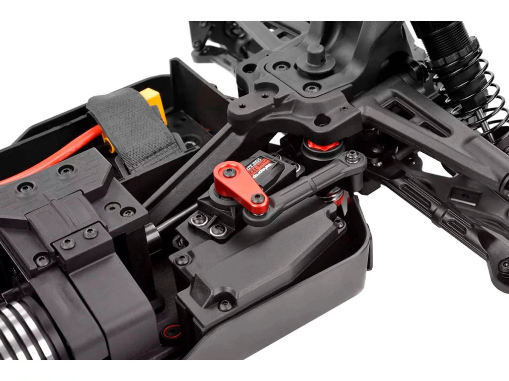 Srdcem výkonného balíčku Syncro4 Ready-to-Run je impozantní 4pólový bezsenzorový střídavý motor Kuron 725 2150 kV, který poskytuje bezkonkurenční kombinaci výkonu a účinnosti. Partnerem této bestie je elektronický regulátor otáček Torox 135, který vyniká plynulostí a spolehlivostí při krocení síly 4S LiPo. Přesnost řízení zvyšuje digitální vysokorychlostní servo HV7225 s robustními kovovými převody a působivým točivým momentem 25 kg. Tato špičková elektronika, podobná osvědčeným komponentám v modelech, jako jsou Sketer a Radix4, je zárukou vzrušujícího a spolehlivého off-roadového zážitku s modelem Syncro4.