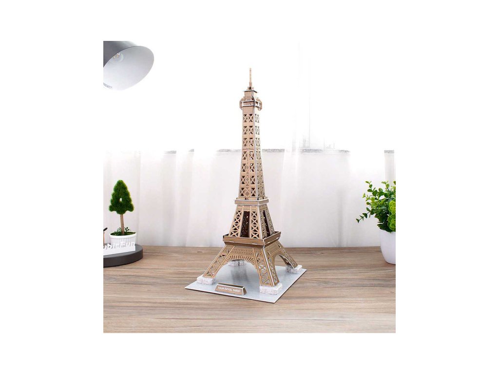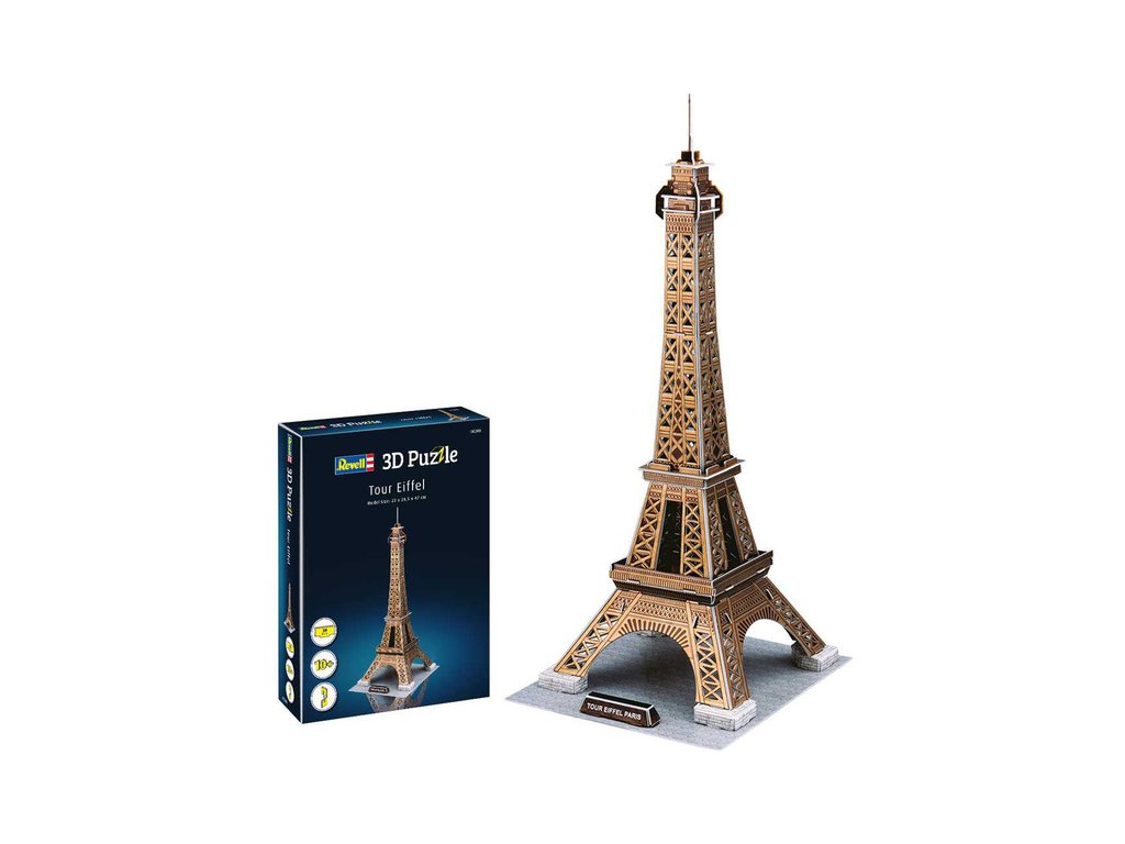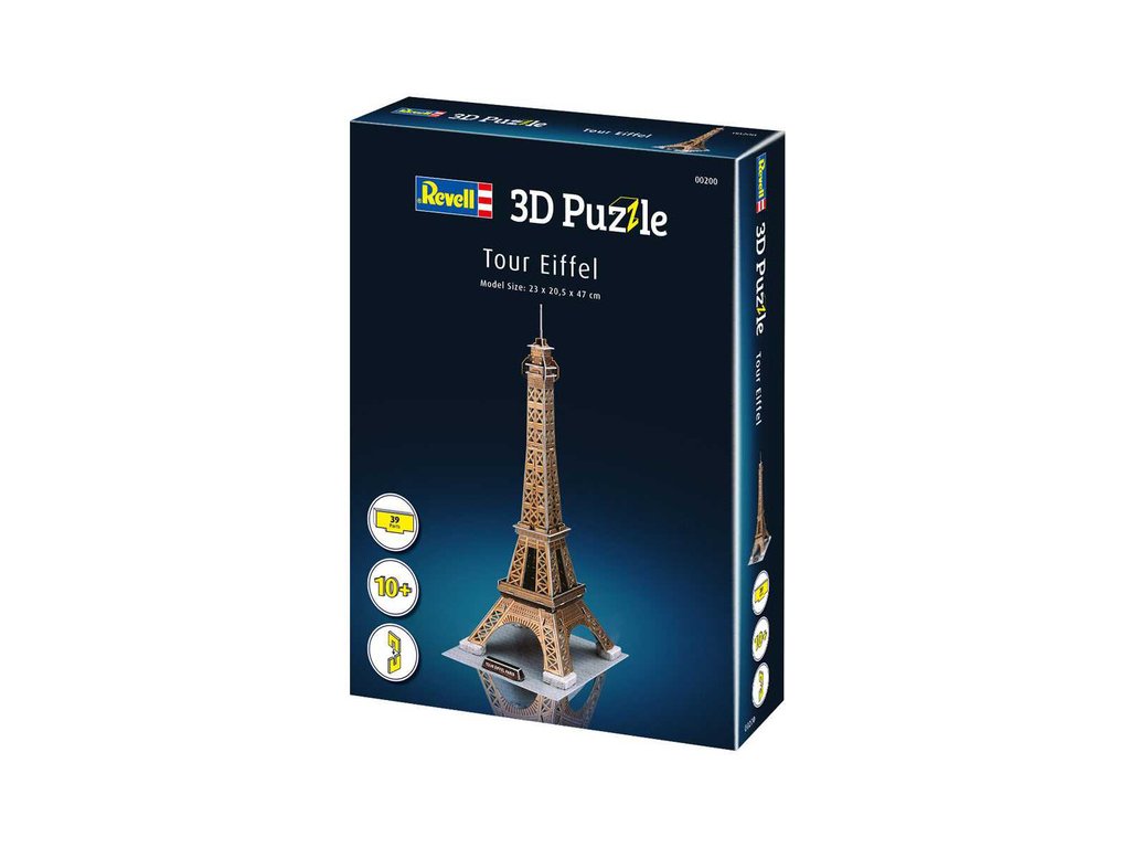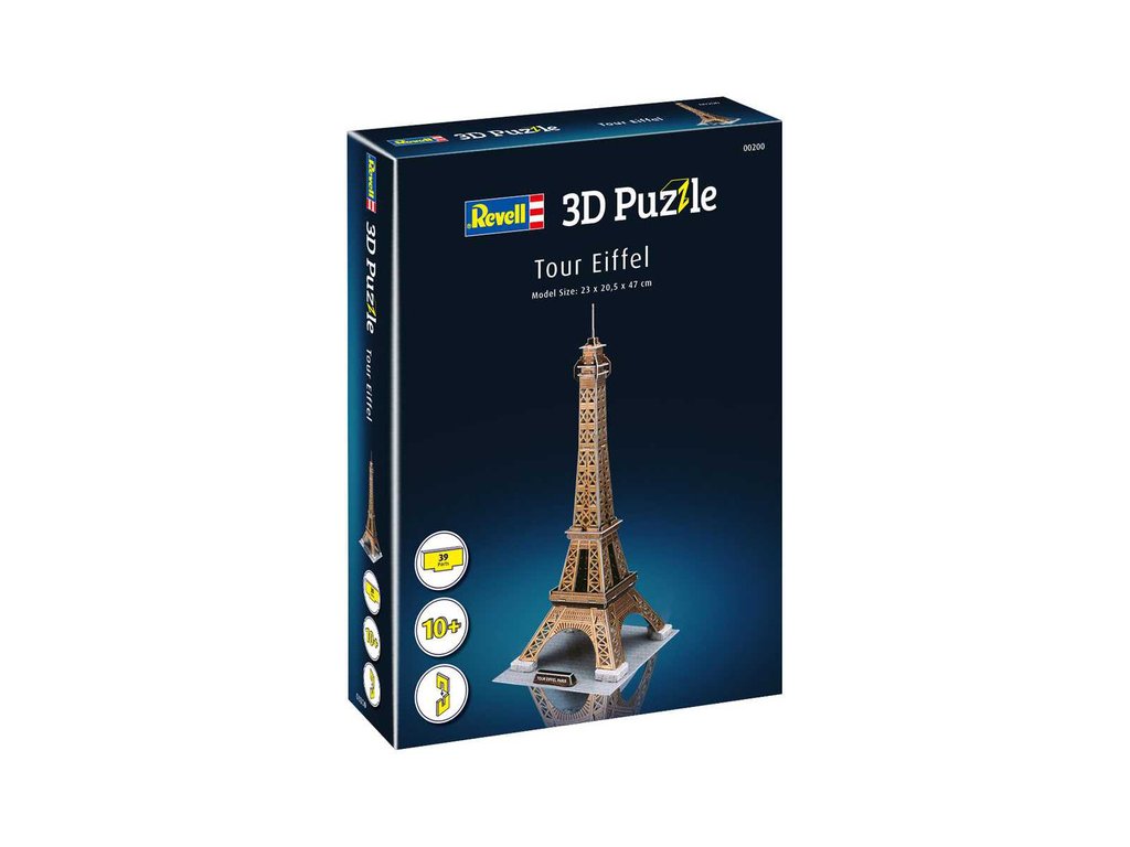 Prostorové 3D Puzzle Revell 00200 – Eiffelova věž v Paříži. Stavebnice má 39 dílků, výsledné rozměry modelu jsou 230 x 205 x 470 mm.