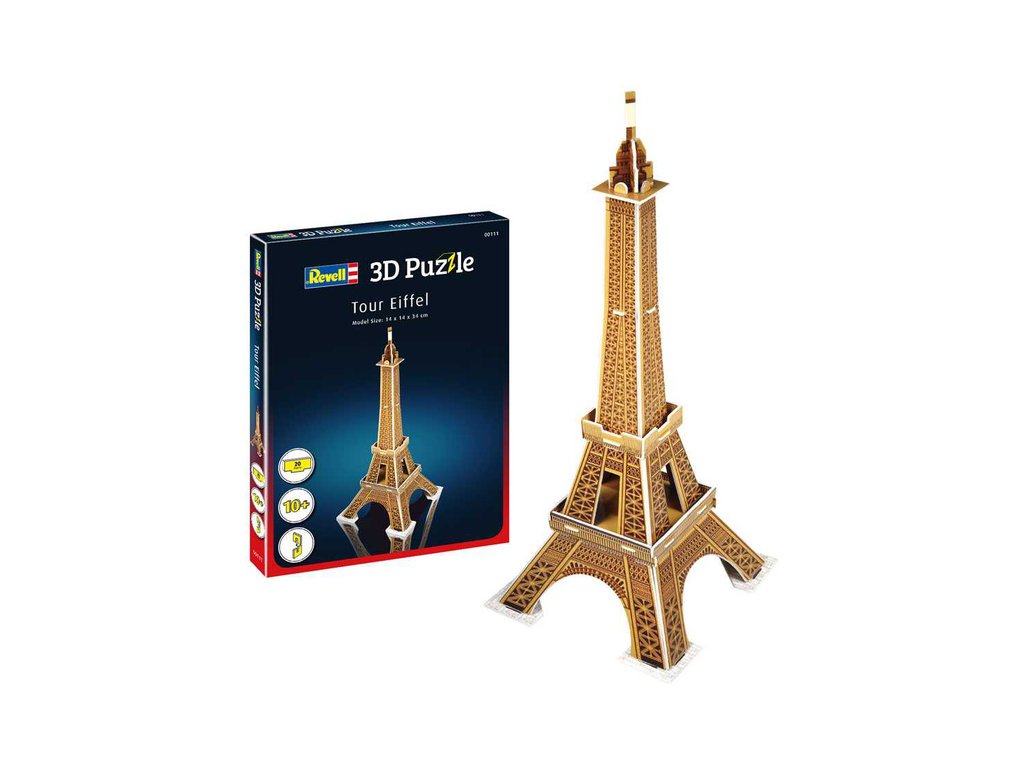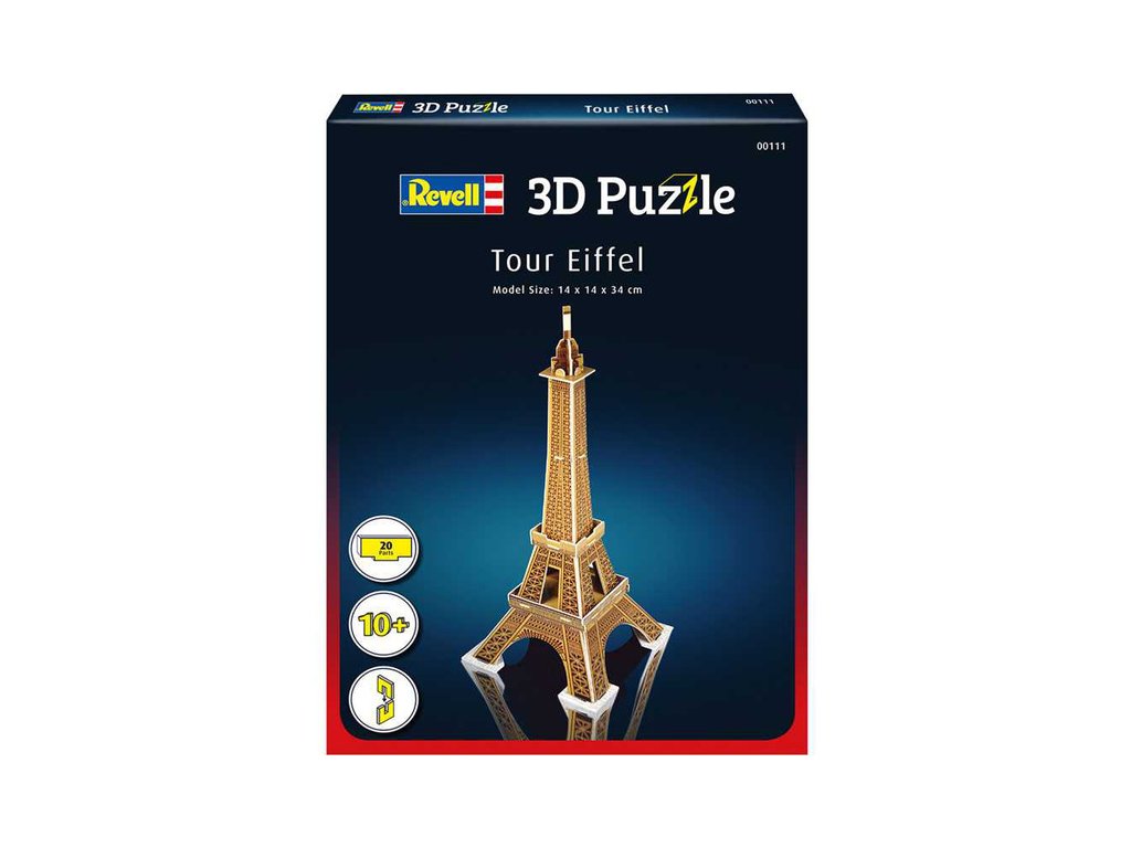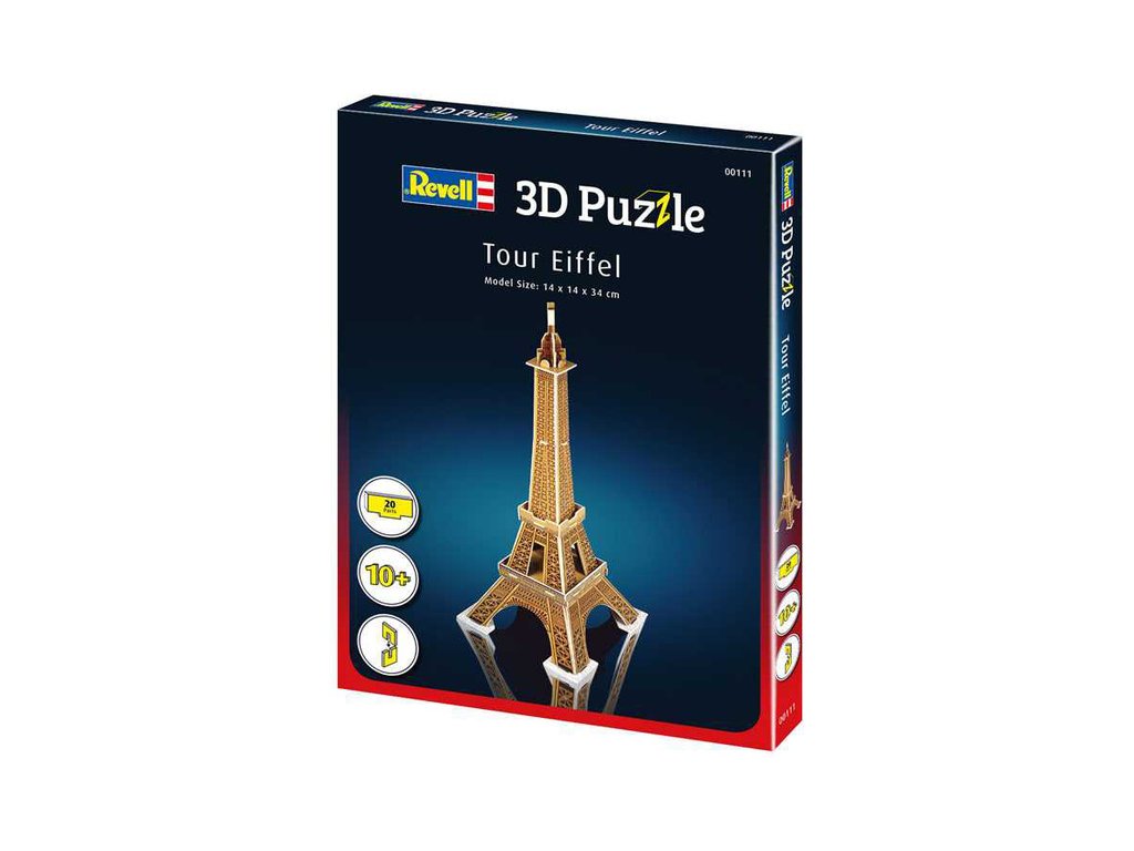 Prostorové 3D Puzzle Revell 00111 – Eiffelova věž. Stavebnice má 20 dílků, výsledné rozměry modelu jsou 140 x 140 x340 mm.