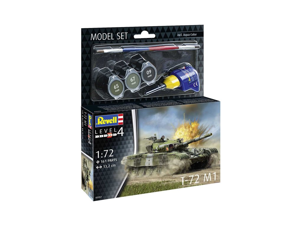 Revell plastikový model T-72 M1 v měřítku 1:72 ke slepení. Stavebnice obsahuje 161 dílků, délka 13.2 cm, obtížnost 4.