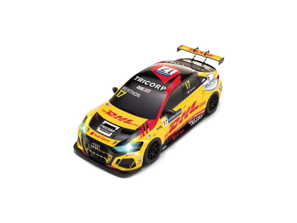Dráhové autíčko SCX Compact Audi RS3 LMS TCR Berthon v měřítku 1:43, pro autodráhy SCX Compact. Autíčko je vybaveno LED světly.