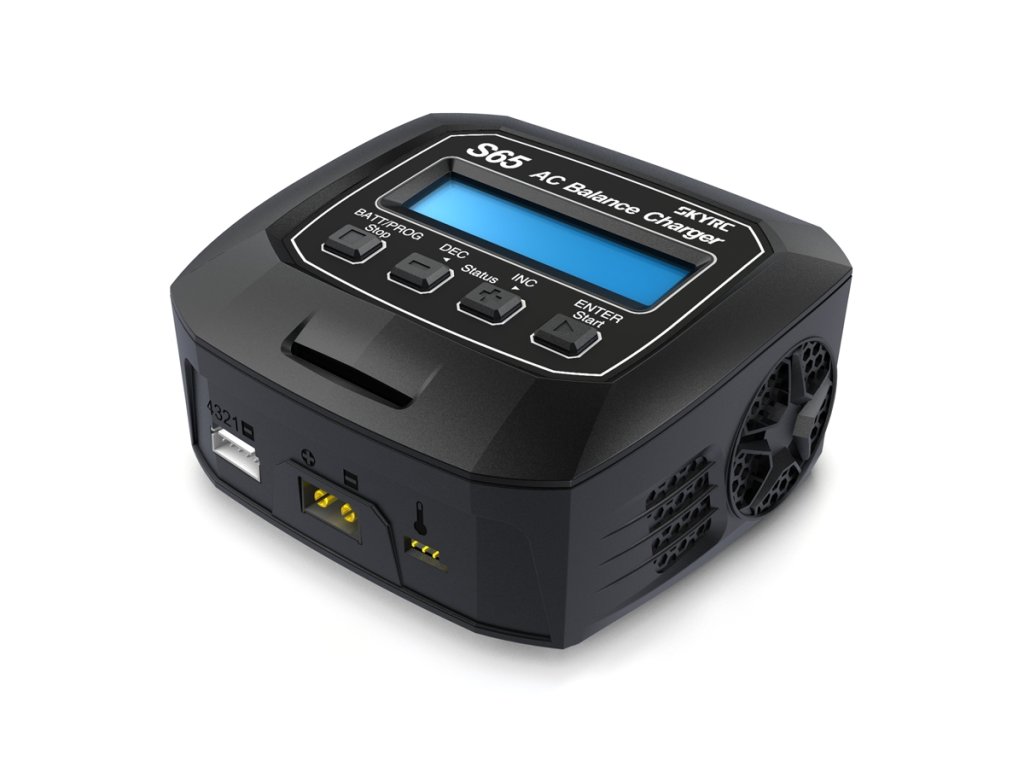 SKY RC S65 65W je malý univerzální nabíječ se síťovým napájením s jednoduchou obsluhou pro domácí nabíjení všech typů akumulátorů. S65 umožňuje nabíjet a vybíjet běžné typy článků (NiCd, NiMH, Li-poly, Li-ion, Li-Fe, LiHV, Pb), navíc je vybaven vestavěným čtyřkanálovým balancerem, který zajišťuje velmi bezpečné a komfortní nabíjení lithiových akumulátorů.