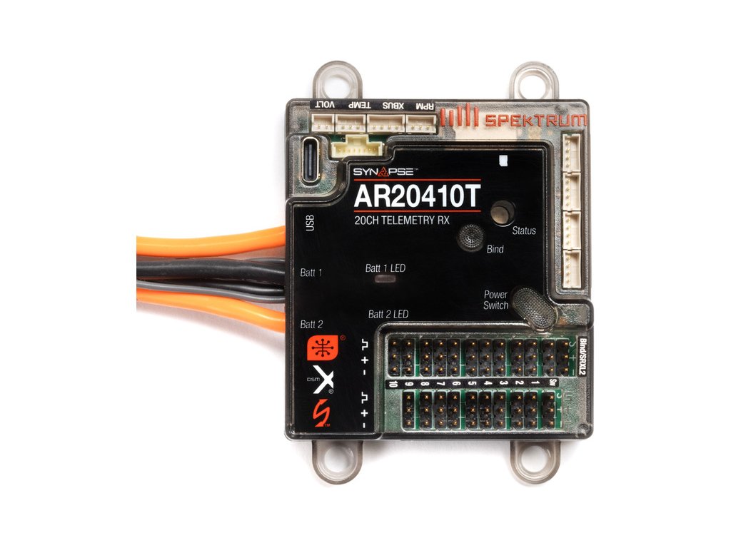 Spektrum přijímač AR20410T 20CH PowerSafe Synapse AS3X+ je určen pro obří RC modely letadel a jety. Funkcemi nabitý 20-kanálový přijímač s telemetrií s plným dosahem. Revoluční letový stabilizační modul Spektrum Synapse™. Dva silové vstupy, 4 ks externí přijímače, vypínač. Přijímače Spektrum PowerSafe jsou navrženy pro modely využívající četná serva a příslušenství, které odebírají nadměrný proud, jako na obřích modelech letadel a modelech jetů. Nyní s inovativními funkcemi, jako je rychlé obnovení spouštění, podpora regenerativního serva, režim vzdáleného spánku a zcela nový modul Synapse AS3X+.