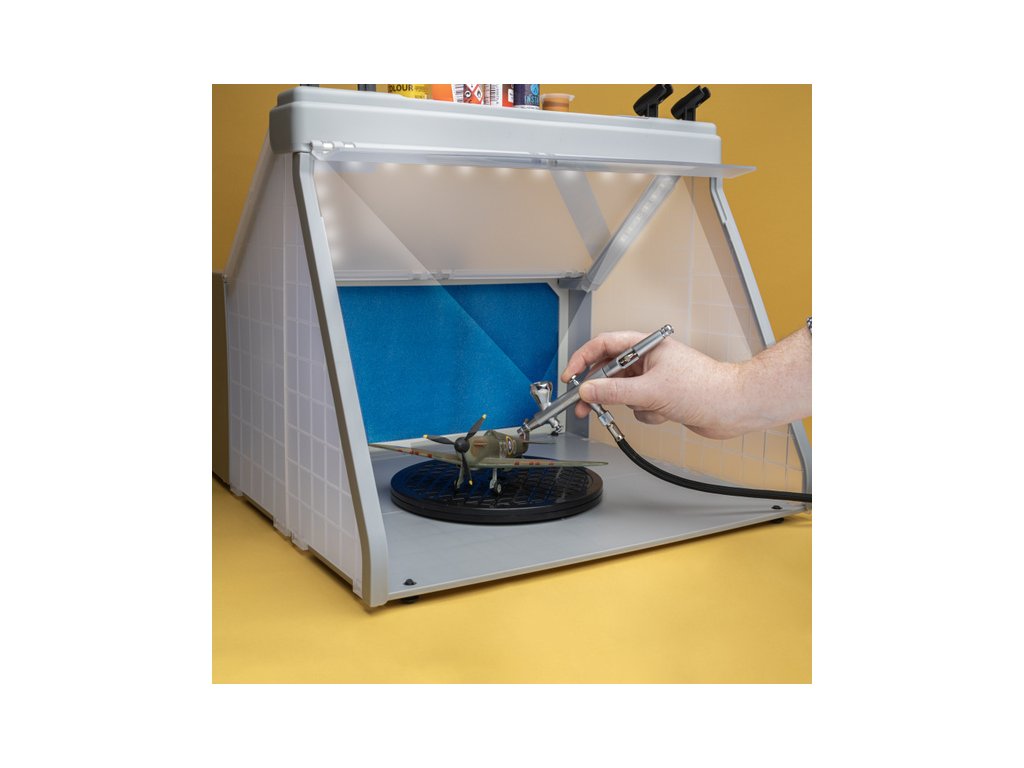 Spraycraft stříkací box s odsáváním, otočným stolem 220 mm, ventilační hadicí a filtrem. Napájení 230 - 240 V/50 Hz, sací výkon 3 m³/min, pracovní vnitřní prostor 40,5x21,5x29 cm. Stříkací box je praktické řešení pro všechny modeláře, hobby tvůrce i profesionály, kteří pracují s airbrushem a aerosolovými spreji. Box pomáhá zachytit přebytečnou barvu a výpary při stříkání, čímž udržuje pracovní prostor čistý a zlepšuje pracovní podmínky. Díky integrovanému odsávání a filtračnímu systému zachytí většinu rozprášených částic barvy. Integrované LED osvětlení pro dobrou viditelnost při práci. Na Vrchní straně boxu je přihrádka pro lahvičky od barev a držáky pro stříkací pistole.