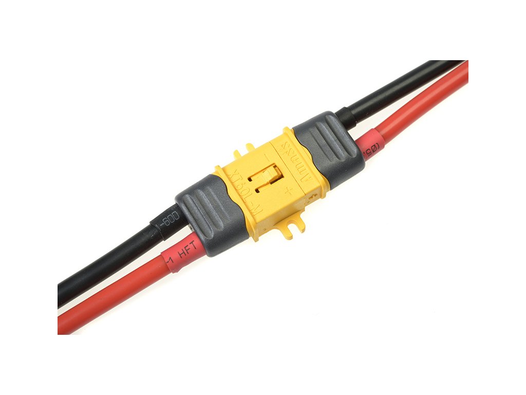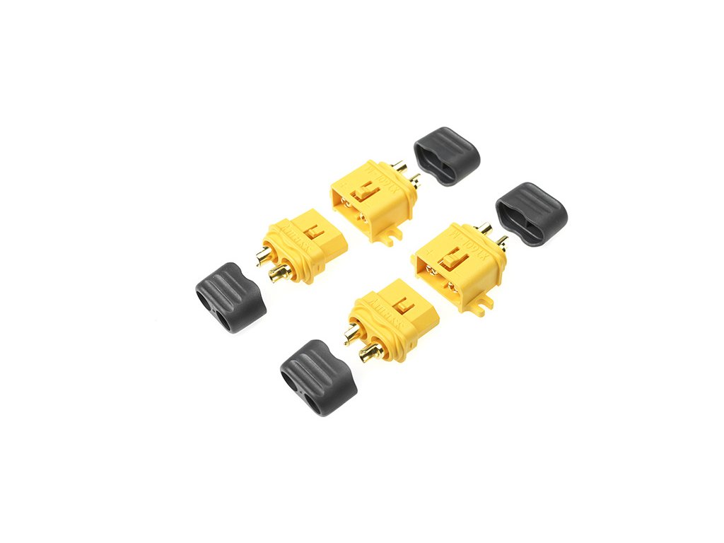 Zlacený konektor XT-60L s plastovým krytem a úchytkami pro šrouby. Balení obsahuje 2 páry.