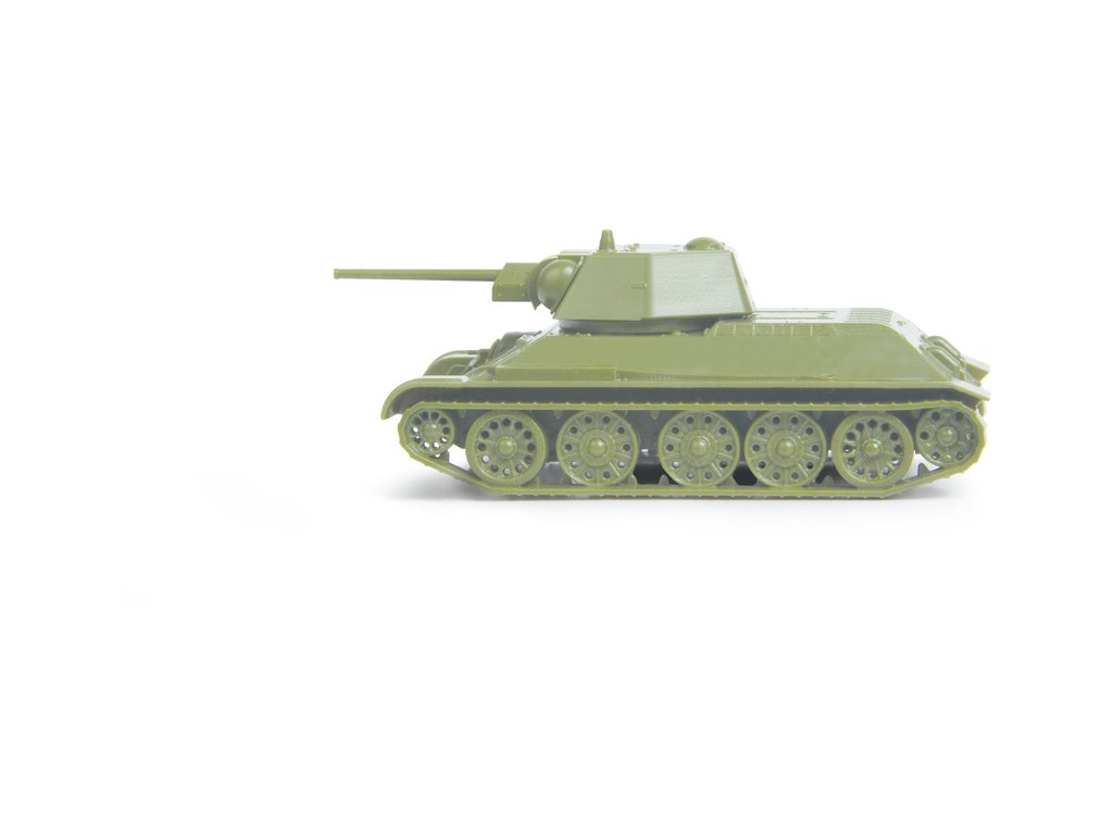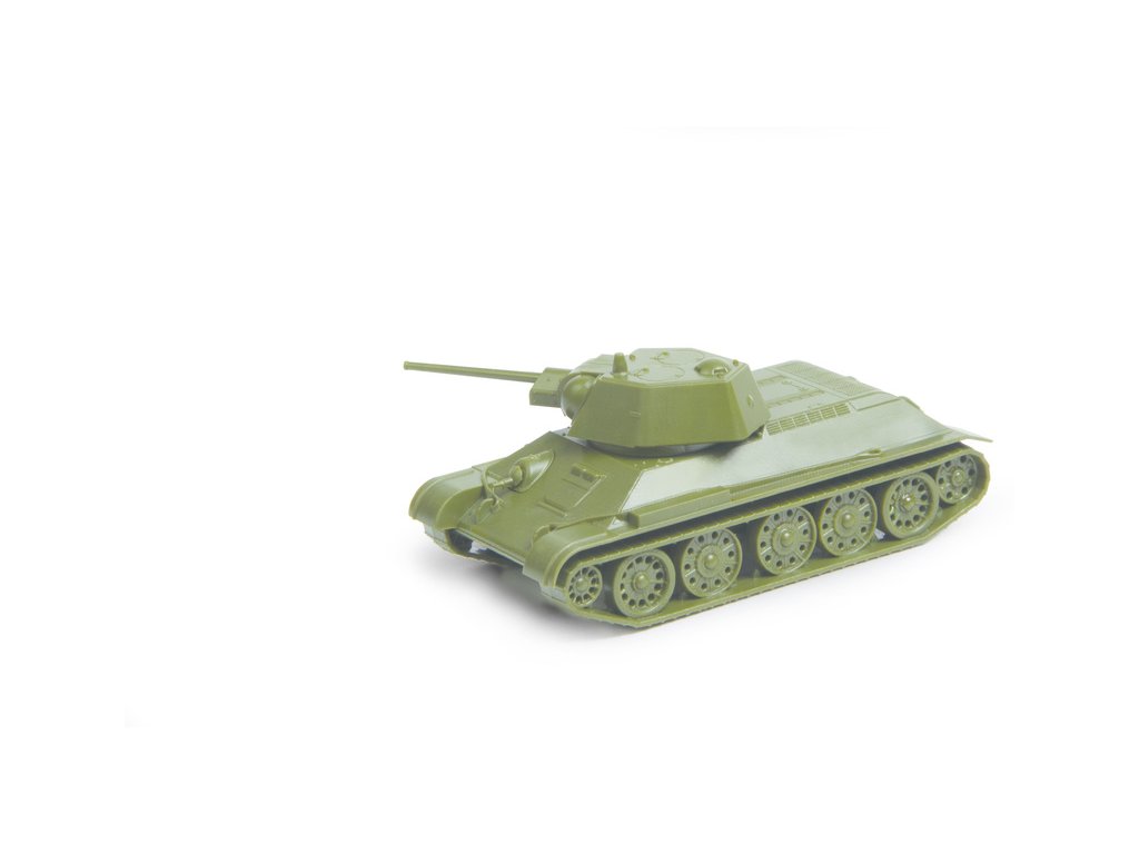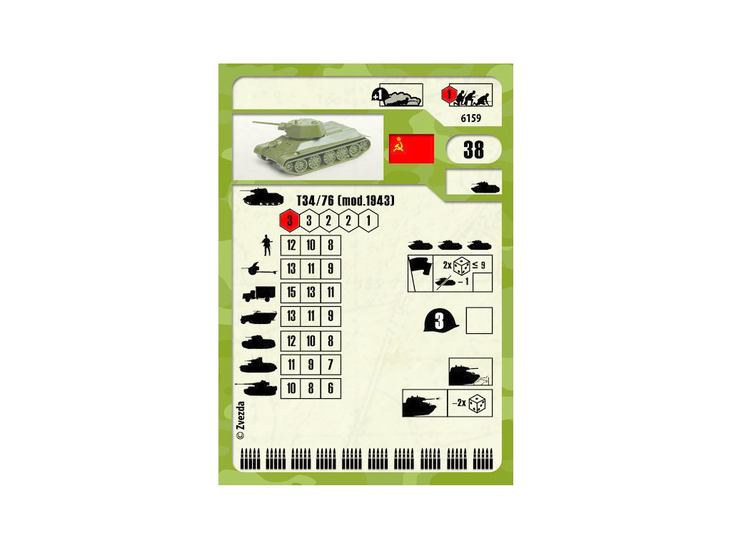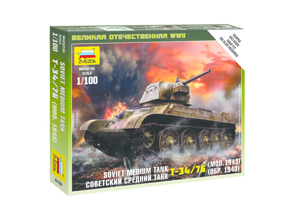 Rychlostavebnice plastikového modelu Zvezda 6159 - sovětský střední tank T-34/76 z roku 1943. Měřítko 1:100, délka 6 cm. Stavebnice obsahuje 8 dílků ke složení.